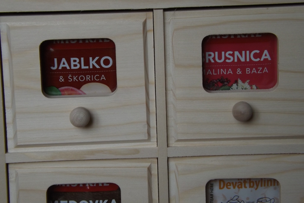 Through the plexi-glass window in each drawer, you can see what sort of tea the drawer holds. The inner size of each drawer is 80x150x80mm. You can lay in the drawer individual tea bags as well as the usual paper box that you buy tea in.