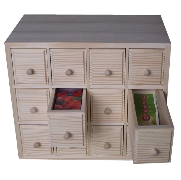 This tea cabinet is made of spruce wood combined with birch plywood (drawers and the back of the cabinet) and maple plywood (handles). It contains 12 drawers with inner size 5,7x17x7,2cm. The surface has been sanded smooth, with no further treatment.