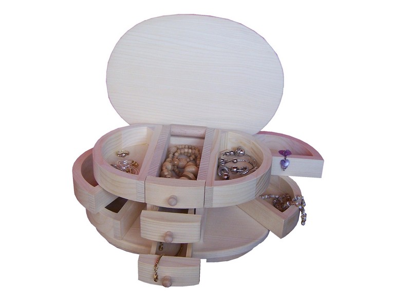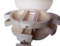 This jewellery box is made of spruce wood, sanded, without surface treatment. It consists of two drawers in the middle part, two pairs of rounded drawers and three compartments under the folding lid. All mechanisms are made of wood.