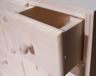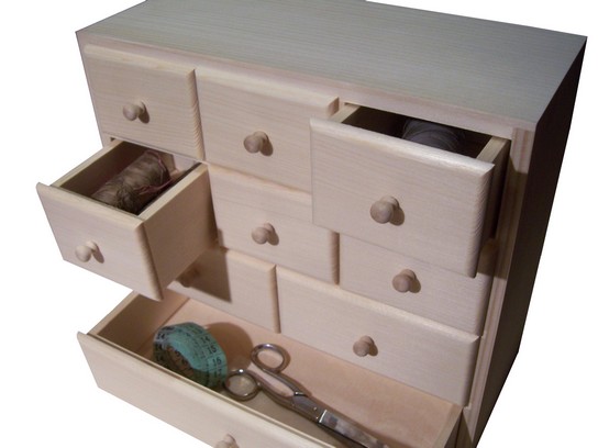 This box with nine drawers is perfect to store various small objects for your hobby. The box is made of solid spruce wood, combined with birch plywood (the back part of the box and bases of the drawers), the handles of the drawers are made of maple wood. The fronts of the drawers are rounded, the drawers are inserted.