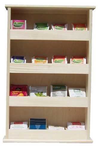 This standing tea shelf for 16 sorts of tea is made of spruce wood combined with birch plywood (back part). Delivery without decoration and surface treatment, sanded smooth.