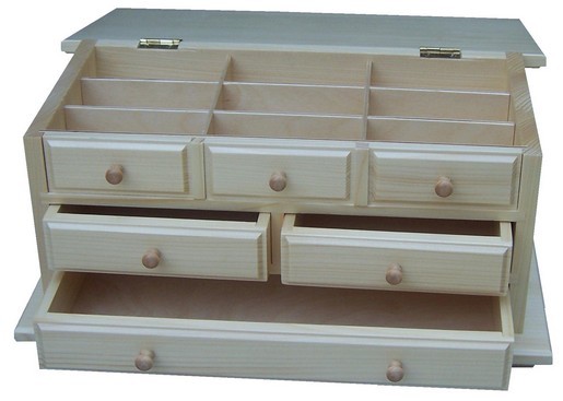 This jewellery box made of spruce wood is varnished with hard oil certified for the use for toys. It consists of two smaller drawers as well as one large storage compartment under the folding lid that you can divide into 9 smaller compartments with a detachable partition.
