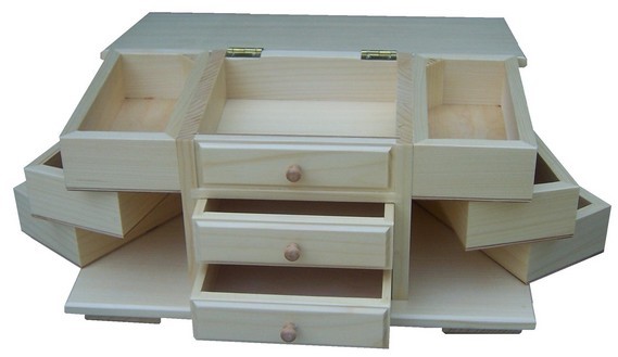 This jewellery box made of spruce wood is varnished with hard oil certified for the use for toys. It consists of two drawers in the middle part, two drawers opening to the side on both sides and three compartments under the folding lid.