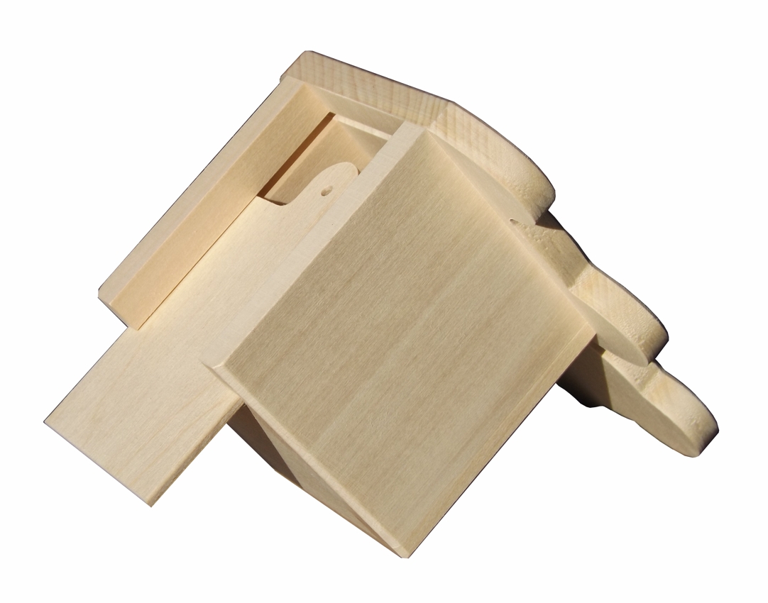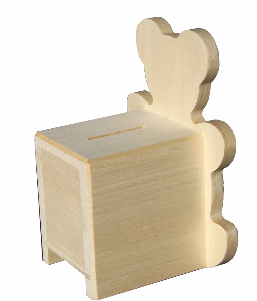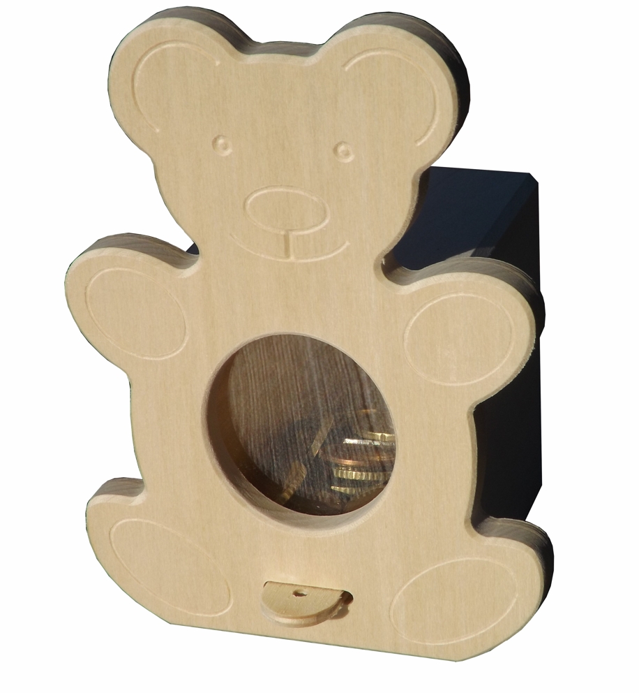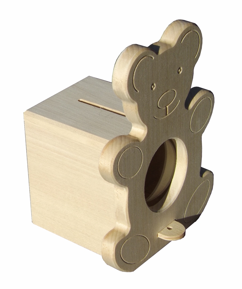 The wooden savings box for children in the form of a bear is made of linden wood combined with birch plywood (lockable sliding bottom). The transparent acrylic glass window lets one observe how the savings box is being filled. The inner size of the room for money is 5,5x7,5x7 cm. Delivery without surface treatment, sanded smooth.