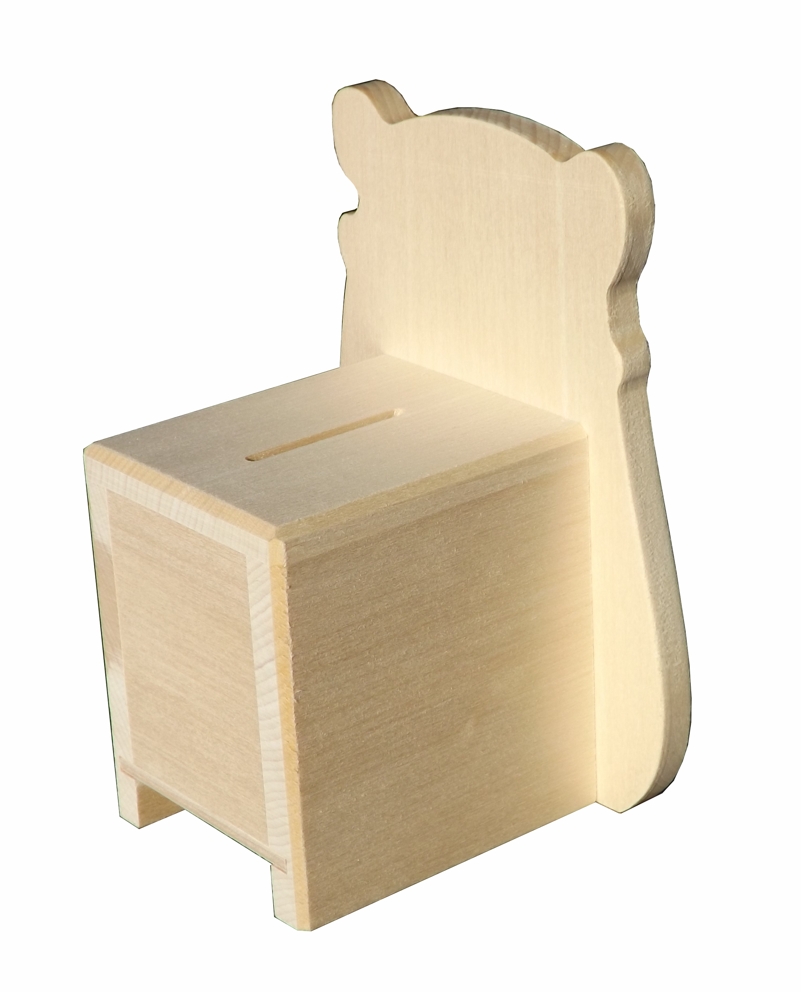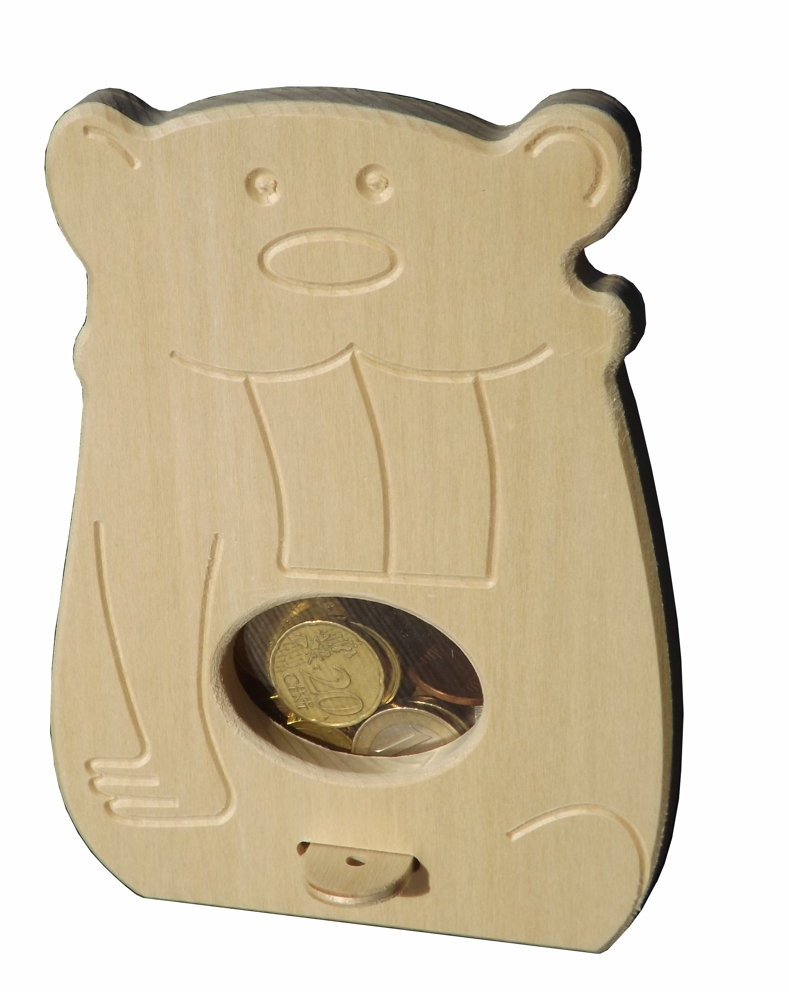 The wooden savings box for children in the form of a beaver is made of linden wood combined with birch plywood (lockable sliding bottom). The transparent acrylic glass window lets one observe how the savings box is being filled. The inner size of the room for money is 5,5x7,5x7 cm. Delivery without surface treatment, sanded smooth.