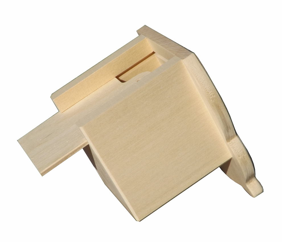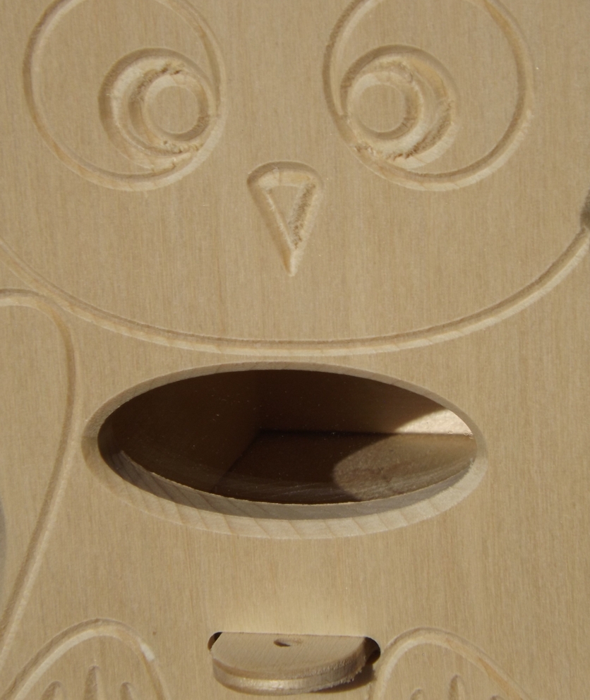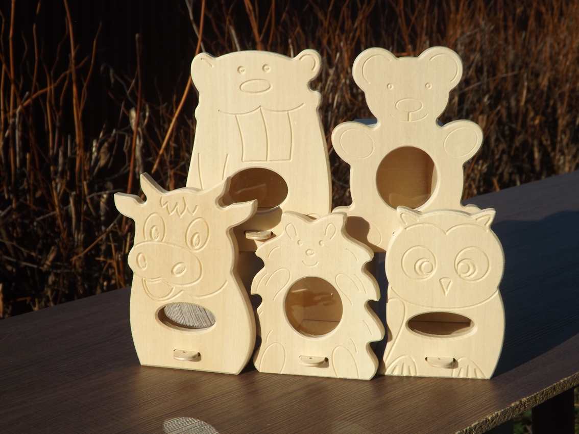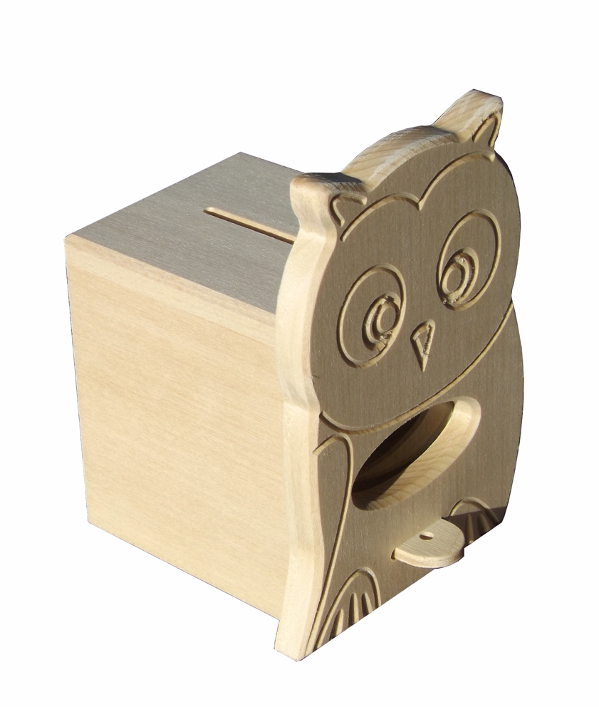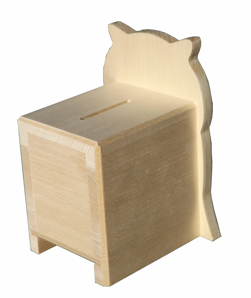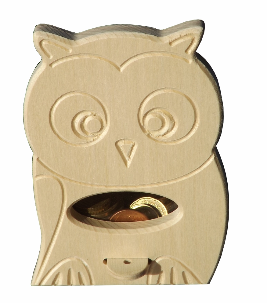 The wooden savings box for children in the form of an owl is made of linden wood combined with birch plywood (lockable sliding bottom). The transparent acrylic glass window lets one observe how the savings box is being filled. The inner size of the room for money is 5,5x7,5x7 cm. Delivery without surface treatment, sanded smooth.