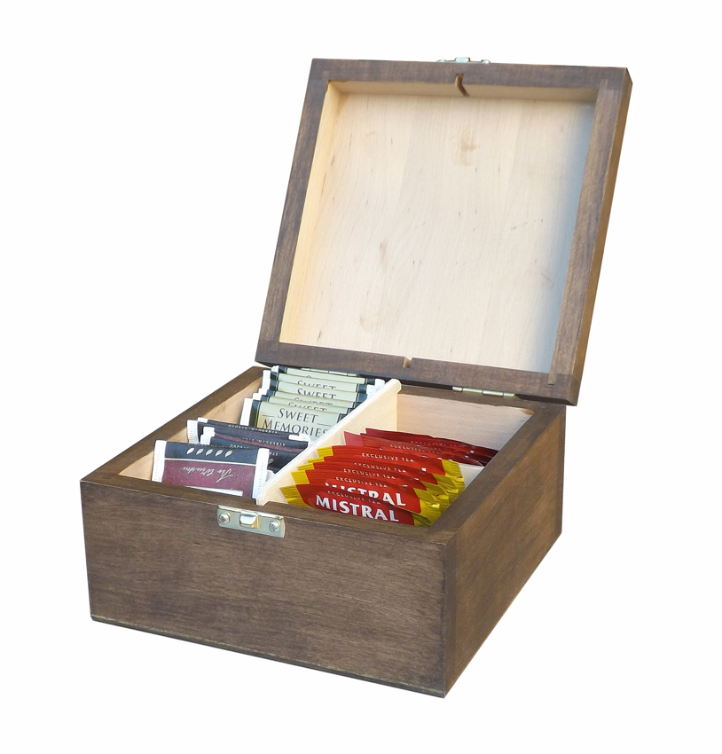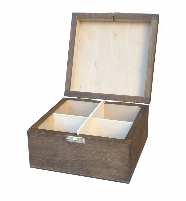 Die Holzkassette ist aus Erlenholz hergestellt, kombiniert mit Birkensperrholz (Boden, Zwischenwände). Der Deckel ist aus Massivholz erstellt, was, anders als bei vielen Konkurrenzprodukten, effektives Abrunden der Kanten erlaubt. Die Kassette ist primär für Aufbewahrung von 4 Teesorten gedacht, was durch die Aufteilung des Innenraums in 4 Abteile unterstützt wird. Die Zwischenwände können aber ausgenommen werden, wodurch man mehr Innenraum gewinnt. Die Oberfläche wurde mit Öl im Farbton Eiche antik behandelt, welches als nahrungsmittelverträglich attestiert ist.