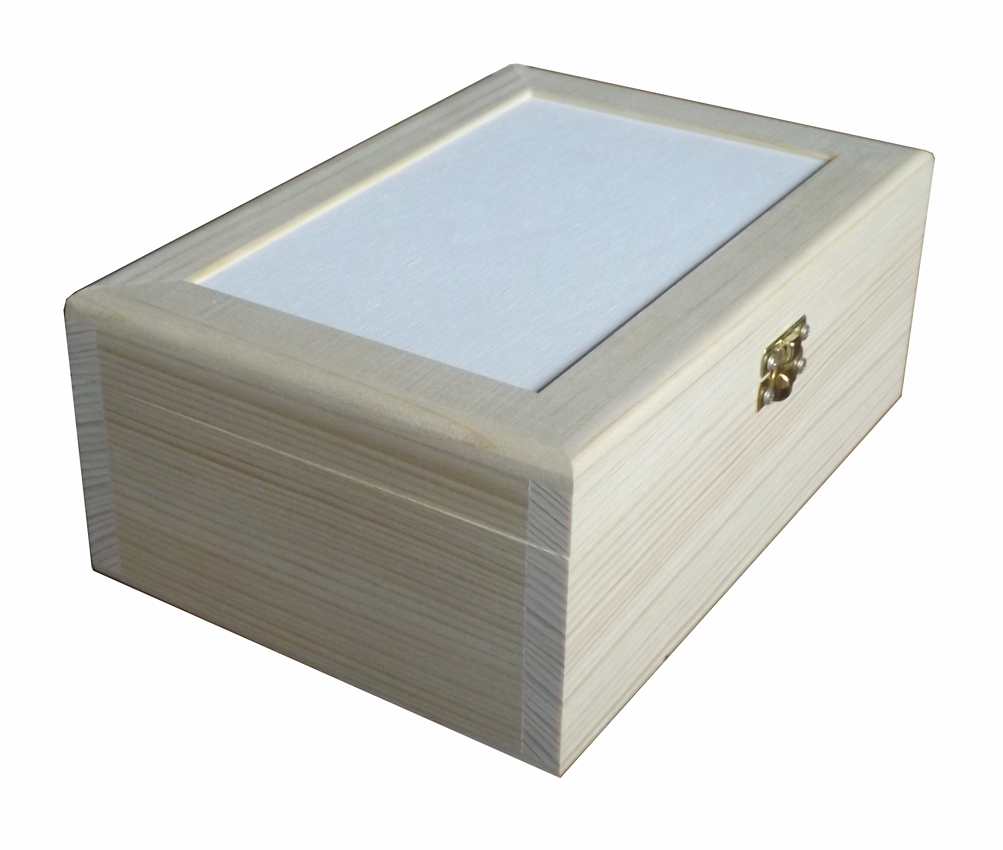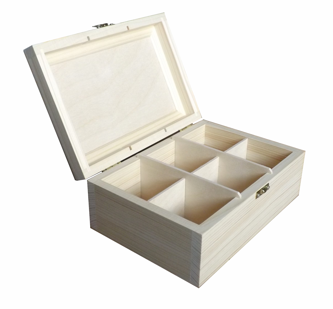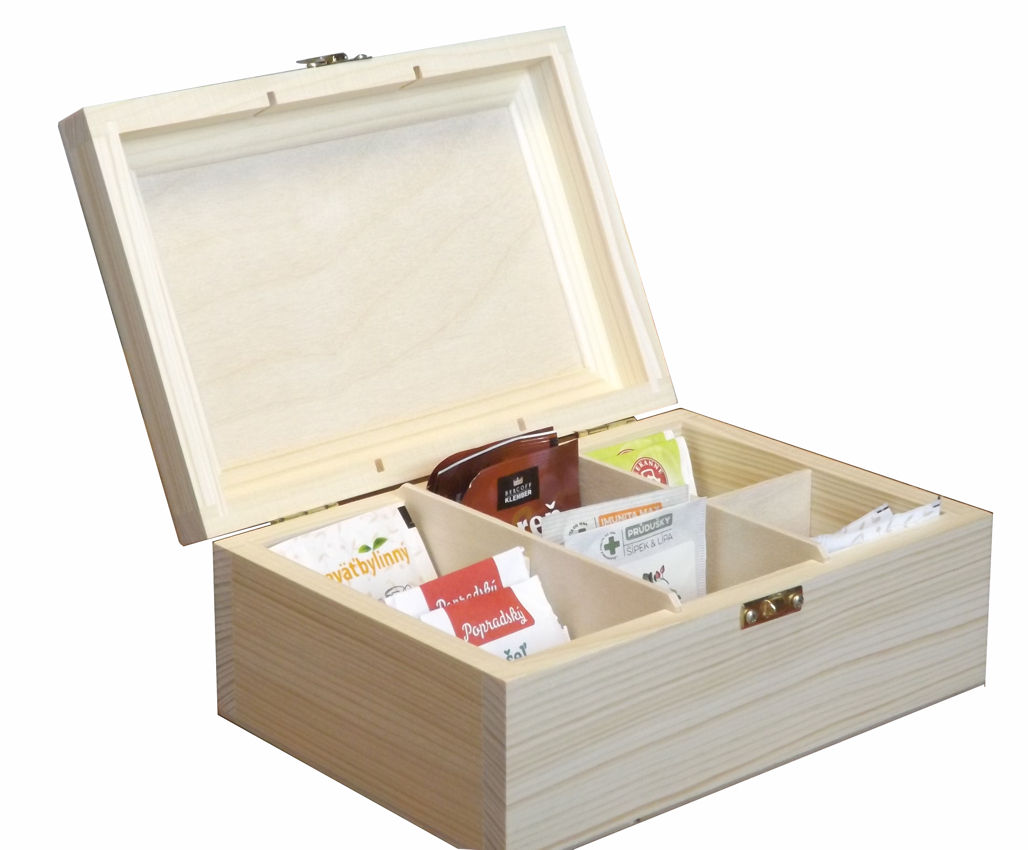 Die Holzkassette ist aus Erlenholz hergestellt, kombiniert mit Birkensperrholz (Boden, Zwischenwände). Der Rahmen des Deckels ist aus Massivholz erstellt, das Innere besteht aus weiß gestreichtem Sperrholz und ist perfekt zum Gravieren geeignet. Die Kassette ist primär für Aufbewahrung von 6 Teesorten gedacht, was durch die Aufteilung des Innenraums in 6 Abteile unterstützt wird. Die Zwischenwände können aber ausgenommen werden, wodurch man mehr Innenraum gewinnt.