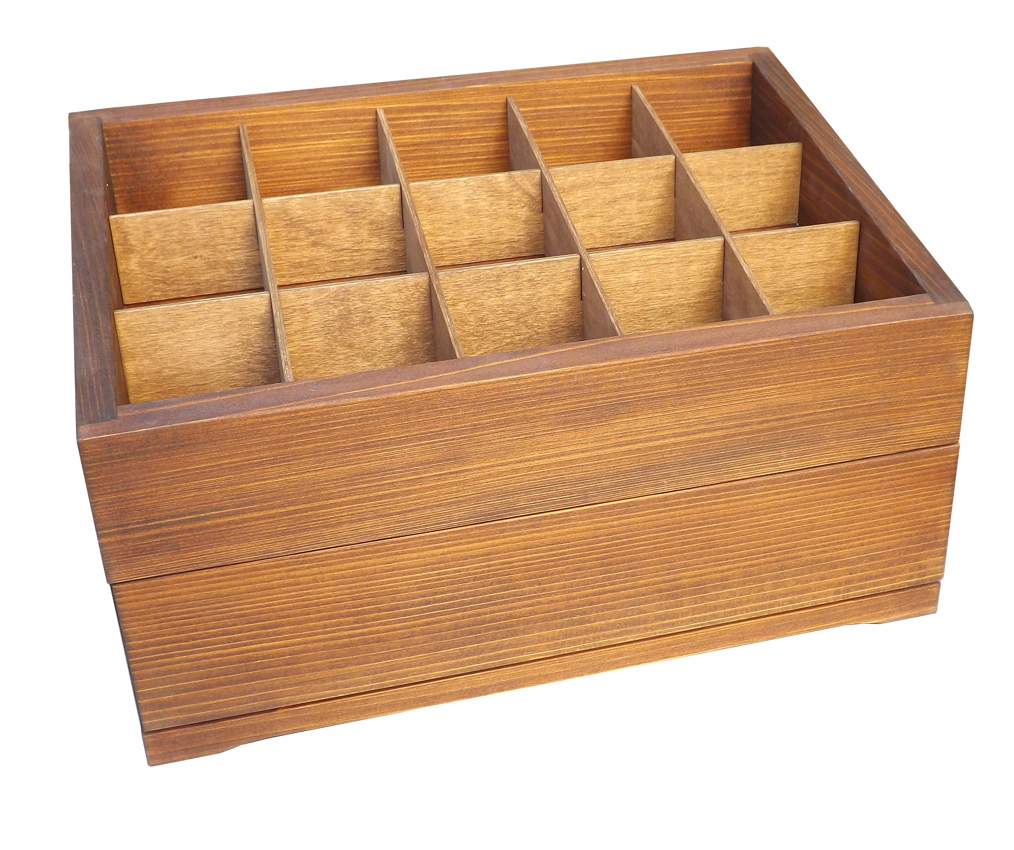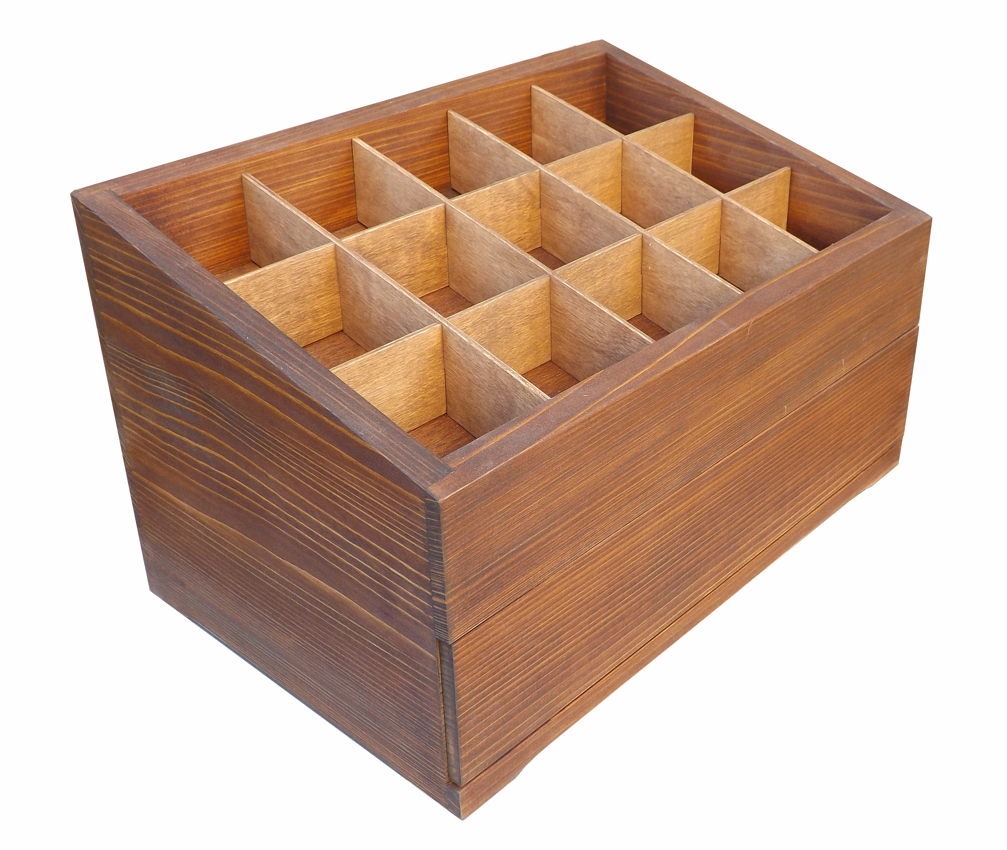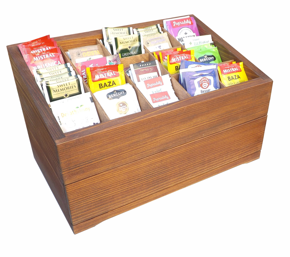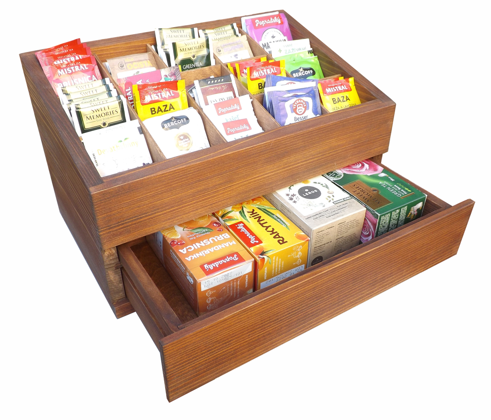 Dieses Schränkchen ist für wahre Teeliebhaber bestimmt. Im oberen Teil kann man 15 Teebeutelsorten aufbewahren, in die Schublade im unteren Teil kann man Teeutensilien oder weitere lose Teesorten ablegen. Die inneren Maße der Schublade betragen 192x330x70 mm. Die Schublade ist auf Bucheleisten gelegt, wodurch sie sich glatt bewegen kann. Das Schränkchen ist aus Fichtenholzhergestellt, kombiniert mit Birkensperrholz (Schubladenboden, Schränkchenboden und die Trennwände des oberen Teils). Die Oberfläche wurde mit braunem als lebensmittelverträglich attestiertem Öl behandelt.