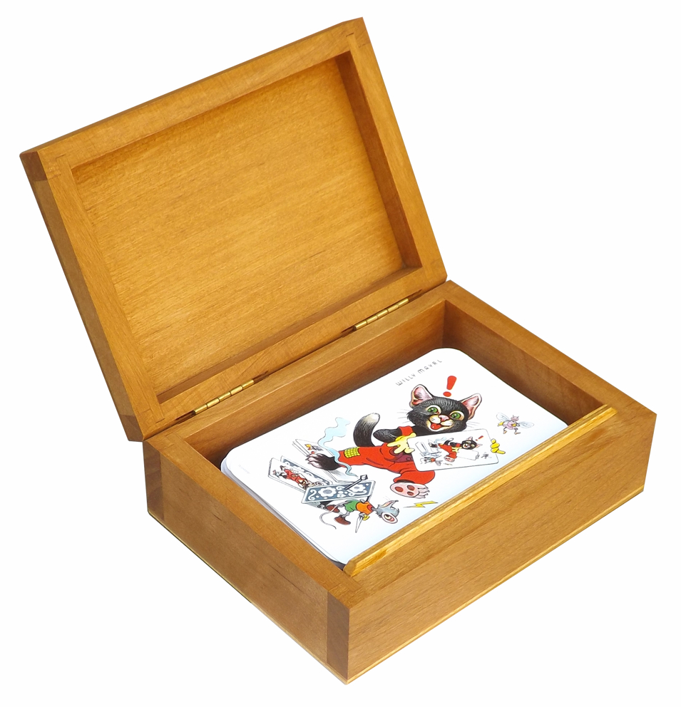 The box is made of alder wood combined with birch plywood (base and clapper). The lid is made of massive wood, which allows to effectively round the edges, other than with many competing products. The box is intended primarily to store one set of tarot or playing cards (e.g. Double German), but there are of course other possible uses. The surface has beed treated with antique oak colored hard wax oil.