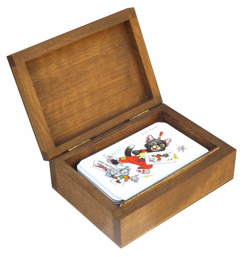 The box is made of alder wood combined with birch plywood (base and clapper). The lid is made of massive wood, which allows to effectively round the edges, other than with many competing products. The box is intended primarily to store one set of tarot or playing cards (e.g. Double German), but there are of course other possible uses. The surface has beed treated with light oak colored hard wax oil.