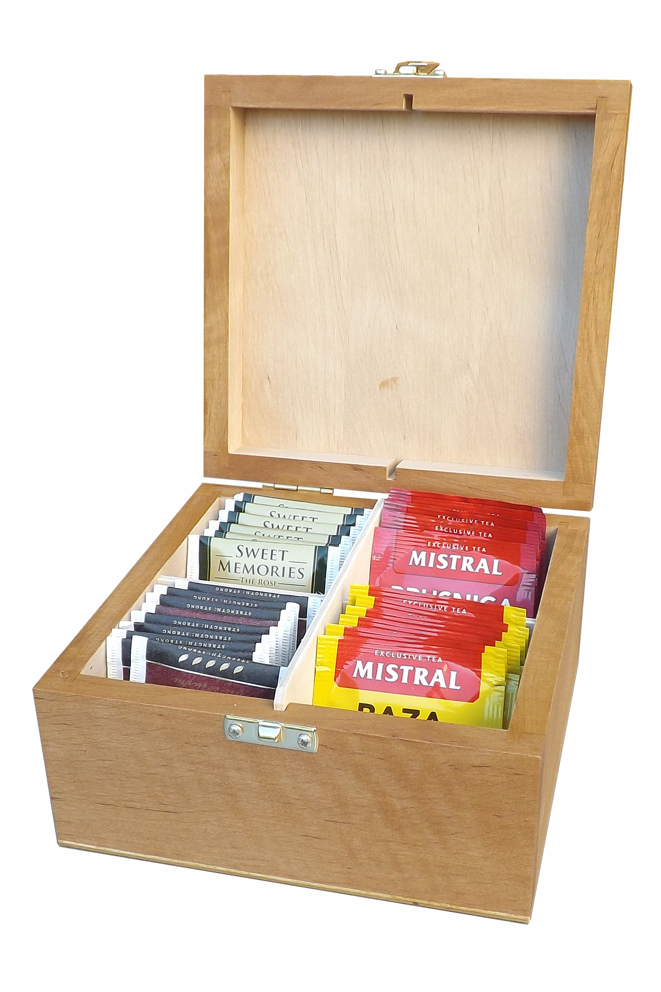 Die Holzkassette ist aus Fichtenholz hergestellt, kombiniert mit Birkensperrholz (Boden, Zwischenwände). Der Deckel ist aus Massivholz erstellt, was, anders als bei vielen Konkurrenzprodukten, effektives Abrunden der Kanten erlaubt. Die Kassette ist primär für Aufbewahrung von 4 Teesorten gedacht, was durch die Aufteilung des Innenraums in 4 Abteile unterstützt wird. Die Zwischenwände können aber ausgenommen werden, wodurch man mehr Innenraum gewinnt. Die Oberfläche wird mit Öl im Farbton Eiche hell behandelt, welches als nahrungsmittelverträglich attestiert ist.