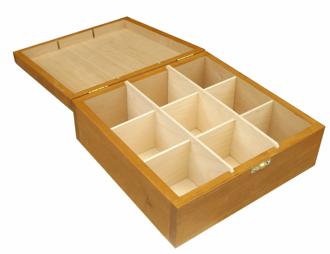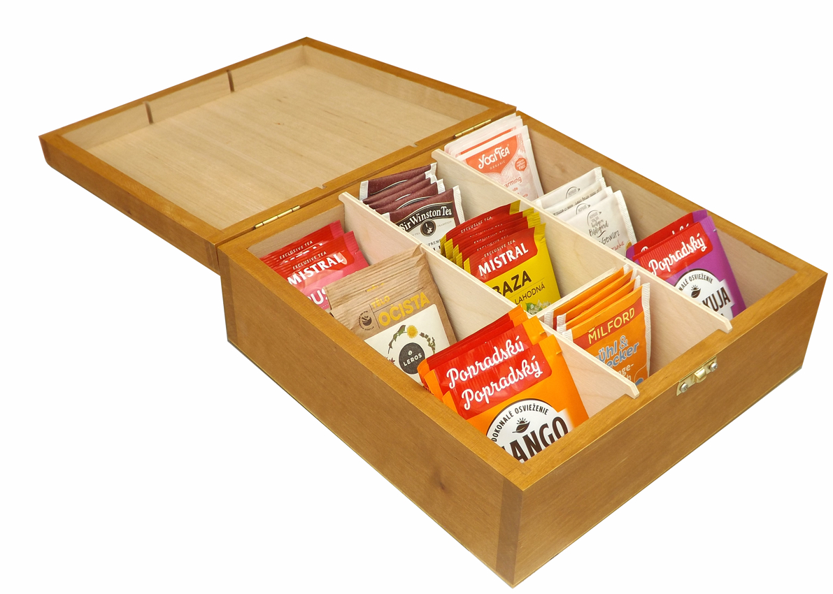 Die Holzkassette ist aus Erlenholz hergestellt, kombiniert mit Birkensperrholz (Boden, Zwischenwände). Der Deckel ist aus Massivholz erstellt, was, anders als bei vielen Konkurrenzprodukten, effektives Abrunden der Kanten erlaubt. Die Kassette ist primär für Aufbewahrung von 9 Teesorten gedacht, was durch die Aufteilung des Innenraums in 9 Abteile unterstützt wird. Die Zwischenwände können aber ausgenommen werden, wodurch man mehr Innenraum gewinnt. Die Oberfläche wurde mit Öl im Farbton Eiche hell behandelt, welches als nahrungsmittelverträglich attestiert ist.